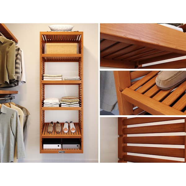 When space is at a premium and additional storage is a must, look no further than this 6ft. Tower with Shelves. Measuring 26.25in. wide, this 100% Solid Wood Tower is perfect for those smaller linen closets and shorter wall spans. The four included adjustable shelves give you the flexibility needed to create the storage you require.What's in the Box?-This item ships in multiple packages-Two 6ft. Tower Sides-One 2ft. Bottom Shelf-One 26.25in. Top Shelf-Four 2ft. Adjustable Shelves-Six Tower Brackets-Two Shelf Mounting L-Clips-All Required Hardware & Fasteners-Assembly Instructions-One Year Manufacturers Limited WarrantyProduct Details-100% Solid Wood-12in. depth -6ft. Height-6.25in. Wide -Integrate into your existing design-Compatible with all Tower Accessories-Adjustable shelving for customized needs-Ventilated sides and shelving for air flow-Use in Closet, Pantry, Linen, Bathroom, LaundrySpecification-Tower:-Depth: 12in. -Exterior Height: 72.75in.-Interior Height: 69.25in.-Exterior Width: 26.25in.-Interior Width: 24in.-Product Weight: 35lbs.-Supported Weight: 25lbs. per lineal foot Included Shelves-Shelf Depth: 12in. -Shelf Width: 24in.-Total Shelf Weight: 14lbs.