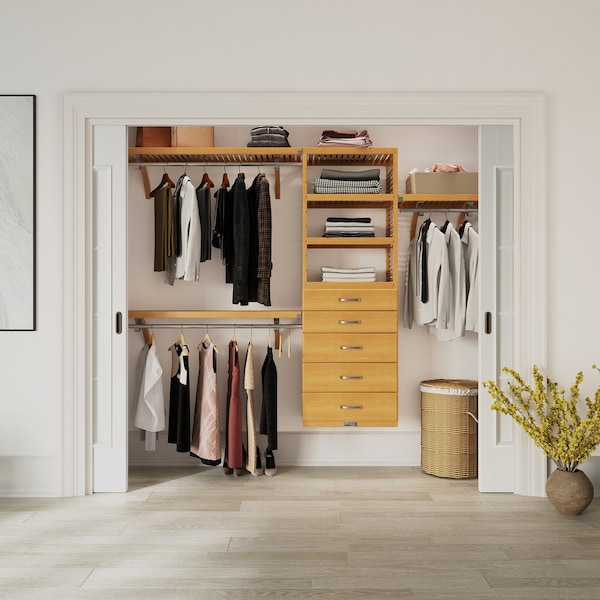 Solid Wood Reach-In Closet System with 5 Drawers Honey Maple