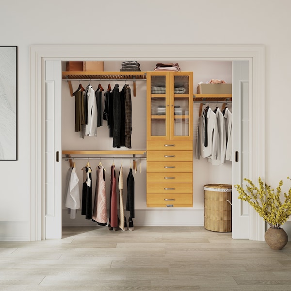 Solid Wood Reach-In Closet System with 6 Drawers and Glass Doors Honey Maple