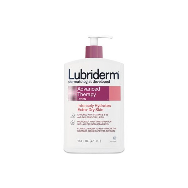 Lubriderm Advanced Therapy Fragrance-Free Daily Moisturizing Lotion helps relieve extra-dry skin. From a dermatologist-developed brand, this moisturizing lotion is clinically shown to help moisturize for 24 hours, and transform dry skin into healthy-looking, more resilient skin. Formulated with vitamins E and Pro-Vitamin B5 plus lipids, this fragrance-free lotion replenishes and strengthens your skin's moisture barrier. Plus, its formula is non-greasy with a clean, comfortable feel. Packing Type: Pump Bottle; Capacity Volume: 16 oz.