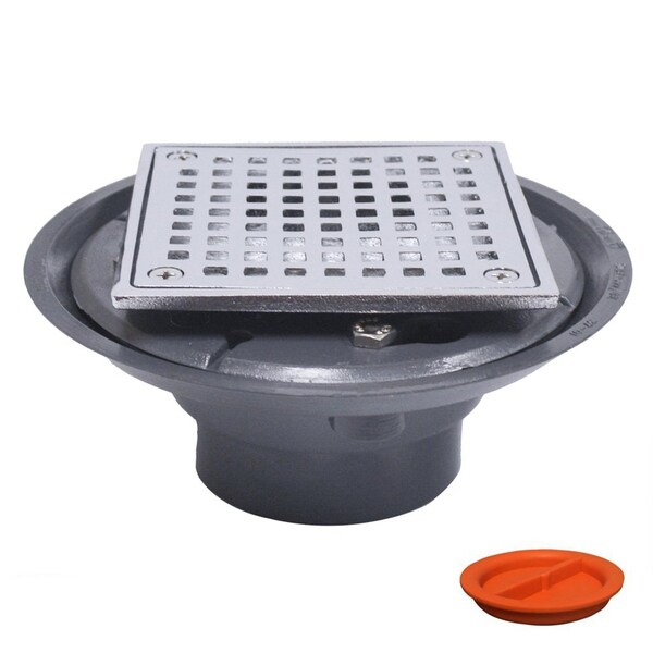 2inX3in PVC Shower Drain, 2in Brass Spud, 4-1/4in Square Chrome Plated Strainer, Grout Ring