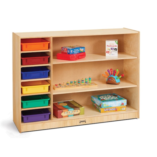 The Jonti-Craft Adjustable Combo Mobile Straight-Shelf with colored Paper-Trays is a versatile and practical storage solution for any classroom or workspace. This mobile shelf unit is designed to provide ample storage space while also offering the convenience of mobility. Constructed with high-quality materials, this shelf unit is built to withstand the rigors of daily use. The sturdy frame ensures stability and durability, making it a long-lasting investment for any educational or professional setting. The straight-shelf design allows for easy access to stored items, making organization a breeze. One of the standout features of this combo mobile shelf is the inclusion of colored paper-trays. These trays not only add a pop of color to the unit but also provide a designated space for storing and organizing papers, books, art supplies, and other materials. The trays are easily removable, allowing for quick and convenient access to the stored items. The adjustable feature of this shelf unit adds to its versatility. The shelves can be adjusted to different heights, accommodating items of various sizes. This flexibility makes it suitable for storing anything from textbooks and binders to art projects and craft supplies. In addition to its functionality, this mobile shelf unit is also designed with safety in mind. The rounded edges and corners reduce the risk of accidents, making it suitable for use in classrooms with young children. Overall, the Jonti-Craft Adjustable Combo Mobile Straight-Shelf with colored Paper-Trays is a practical, durable, and versatile storage solution that will enhance any learning or working environment. With its ample storage space, mobility, and adjustable shelves, this shelf unit is sure to meet all your organizational needs. This item may incur additional shipping charges due to its weight or size.
