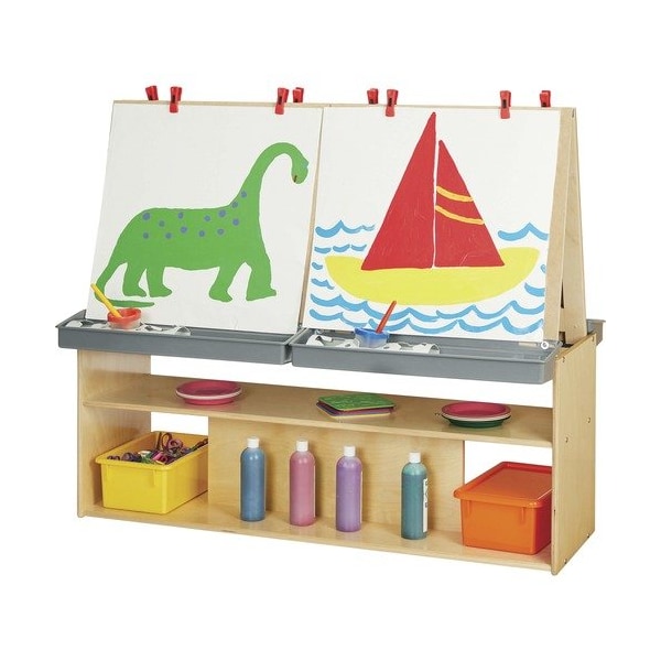 Inspire your young artists with this four-station art center. Ample storage space below helps keep art supplies handy. Rounded edges allow children to play safely without getting hurt by sharp edges or corners. Durable laminate features an easy-to-clean surface. Thermo-fused edgebanding helps seal out moisture.