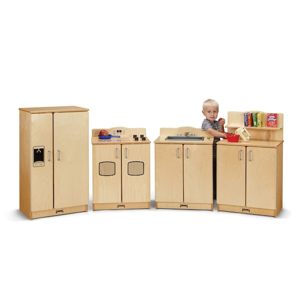 The Jonti-Craft Culinary Creations Play Kitchen 4 Piece Set is the ultimate playtime accessory for little aspiring chefs. This beautifully designed play kitchen set is crafted with utmost attention to detail, ensuring a realistic and immersive cooking experience for children. The set includes four essential pieces that mimic real kitchen appliances. The stove features realistic burners with turning knobs, providing a tactile and interactive element. The sink comes with a removable basin, allowing kids to engage in pretend washing and cleaning activities. The refrigerator features a spacious interior with shelves, perfect for storing play food and beverages. Lastly, the microwave adds a modern touch to the set, complete with a rotating plate and buttons that make clicking sounds. Constructed from durable and child-friendly materials, this play kitchen set is built to withstand hours of imaginative play. The sturdy wooden frame ensures stability, while the smooth surfaces and rounded edges prioritize safety. The vibrant colors and charming details, such as the oven window and faucet, add to the overall appeal of the set. Not only does this play kitchen set provide endless entertainment, but it also promotes various developmental skills. Children can enhance their creativity and imagination as they cook up imaginative meals and engage in role-playing scenarios. The set also encourages fine motor skills, as kids turn knobs, open doors, and manipulate play food. Additionally, it fosters social skills and cooperation as children engage in pretend play with friends or siblings. The Jonti-Craft Culinary Creations Play Kitchen 4 Piece Set is a must-have for any playroom or daycare center. It offers a safe, durable, and engaging playtime experience that will keep children entertained for hours on end. This item may incur additional shipping charges due to its weight or size.