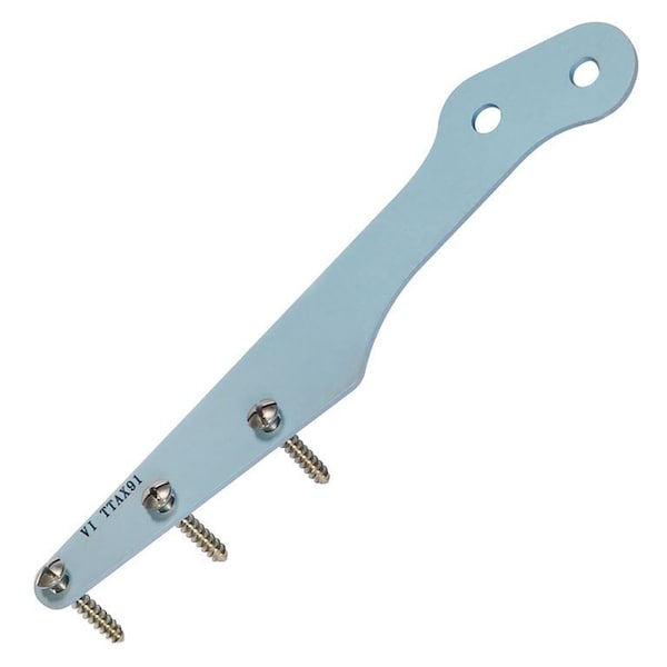 Standard TTA plates rely on a barbed for system for attachment onto the tibial crest. Many surgeons consider that the hardest part of the TTA procedure is preparing for and placing the fork. Forkless TTA plates are screwed onto the tibial crest using 2.4 screws. The distal part of the forkless plate is secured using 2.7 or 3.5mm screws as appropriate. The rest of the pro- cedure is as per the standard technique. Forkless TTA Plate. 104mm