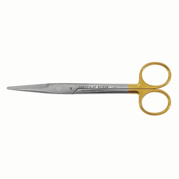 6 3/4", Aesculap Mayo Scissors, Carbide Serrated Inserts, Gold-Plated Finger Rings, Curved