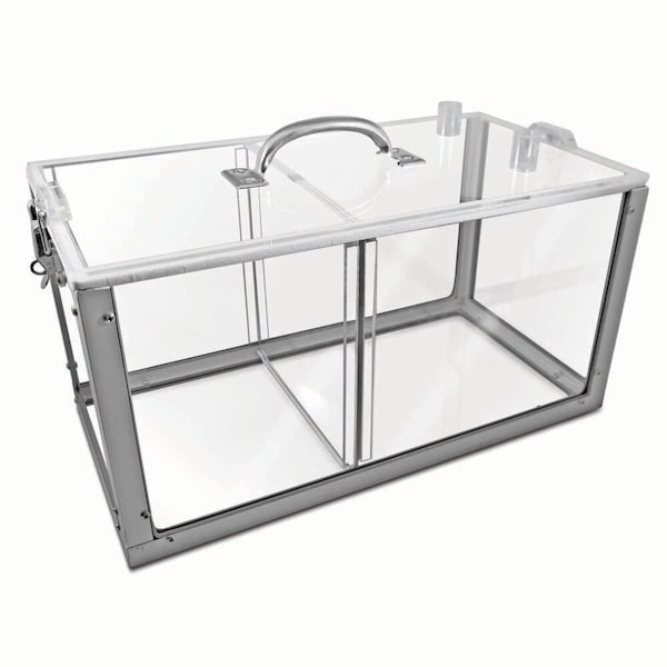 The Lexan anesthesia chamber provides a simple method of induction. Chamber induction reduces physical restraint which minimizes stress and reduces the chance of injury to the operator and animal. The divider system allows for up to four different chamber sizes within one unit: 18" x 9" x 9"; 12" x 9" x 9"; 6" x 9" x 9". Unit weighs 10 lbs.