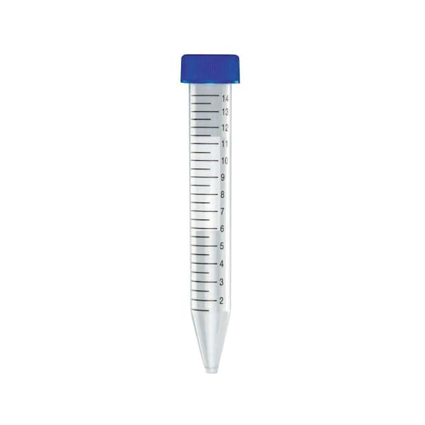 Disposable polypropylene centrifuge tubes are sterilized for critical lab studies. Include polyethylene screw cap with flat top for easy writing or affixing labels. The tubes have bold, easy-to-read white graduations and a large writing area.