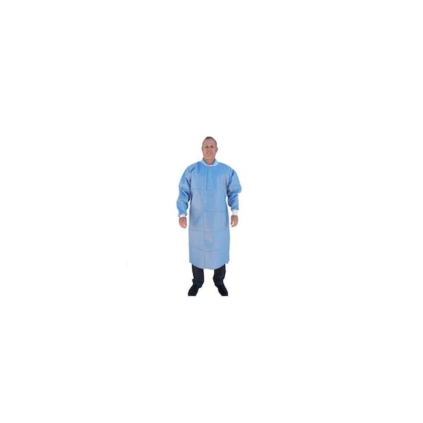 Full back with wrap-around style and knit sleeves. Light-blue fabric. Non-sterile. Can be safely autoclaved and even washed.