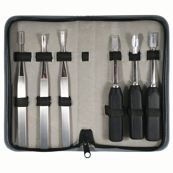 Especially designed to aid in the extraction of equine incisors. Six different size heads with a curved concave head and sharppointed edge. Packed in an attractive zipper case. 3 Instruments: Wider heads and heavier black teflon handle. 20cm (8") L 3 Instruments: Finer heads and lighter stainless steel shaft. 22cm (9") L Weight: 2.3 lbs.