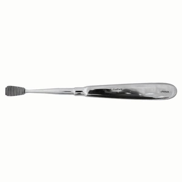 The fine head on the rasp allows easy removal of bone spurs or rough edges in a femoral head excision. The rasp cuts only on the backward stroke.