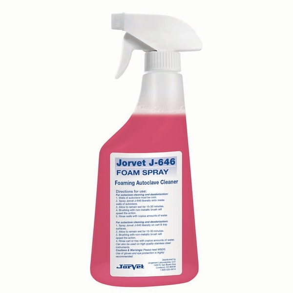 Foaming Autoclave Cleaner. The steam autoclave is a workhorse in today's veterinary clinic. Its heavy use even with distilled water results in dark brown scale deposits on the inside chamber. If not regularly cleaned, these deposits will foul the surgical pack and affect the performance and longevity of the autoclave. It is recommended to clean the autoclave after every 20 cycles, or once per month if used everyday. The JorClave foaming autoclave cleaner will remove all rust spots, stains, and corrosion. In addition scale, alkaline and mineral deposits on the inside chamber walls of autoclave. It also works well on stainless steel carts, trays, or surfaces.Mild acidic solution removes rust, stain, spotting, and corrosionMost other solutions are slightly alkaline, but the actual deposits are alkaline in pH.Foaming action stays on surface longer than standard liquid sprayPump spray goes on easily and quicklyRestores original finishNo more noxious odor from walls of autoclave