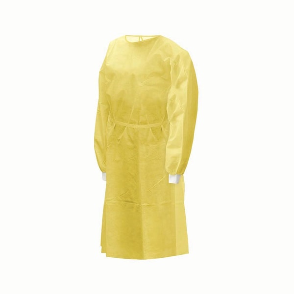 Fluid resistant. Yellow with full back. Knit fabric wrist cuffs. Universal size, full length with ties. Disposable. Universal Size, 50/case.