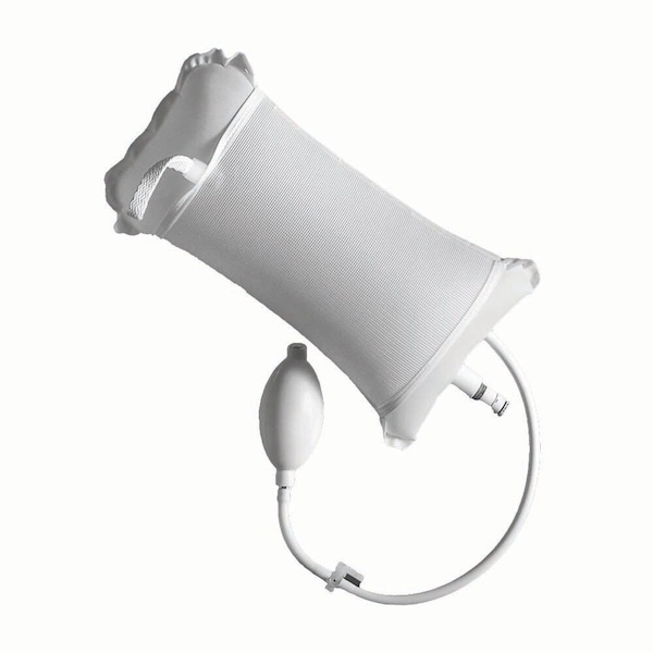 Pressure infuser for collapsible IV bags. IV bag fits inside mesh and nylon bag. A rubber hand pump attached to a 3-way stop cock allows bag to be filled with air, which exerts pressure on the IV fluid bag.