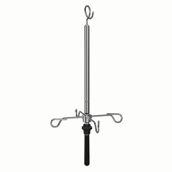 This simple system puts a moveable IV bag holder on a track that is suspended from the ceiling. The IV holder can be positioned above cages, treatment area, or the surgery table. When not in use, it is simply retracted upward and pushed off to the side.Track can be installed into any type of ceiling.Lightweight aluminum track comes in any length sections; can be trimmed with hacksaw if needed.Four-wheel carrier runs in track. It is locked into position by turning it 360 Deg. A pendant ring is attached to carrier.IV holder attached to carrier. it has 4 rams horns at 90 Deg angle. They each can hold an IV bag. It extends and retracts at the push of a button.Oval sections of track are also available.IV holder for four bags (JOR833h)Four-wheel carrier with ring (JOR833c)Two end caps for track (JOR833e)