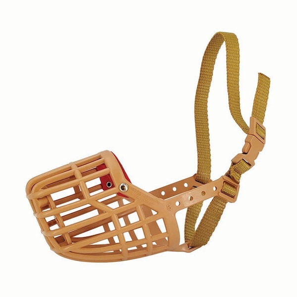 This product is for muzzle use only. It is not to be used with a leash, etc to walk or restrain animal. Constructed of strong nylon plastic with a reinforced nose and strong nylon strap. Tan.Size: 5Breed: Beagle, Border Collie, Cocker, etc.End of Snout Circumference: 2.25"Muzzle Length: 4.25"Circumference of Bridge of Nose: 12"This item is the same as the J0884E except it has the quick release buckle feature.Nylon Basket Muzzle #5, w/ Quick Release Buckle
