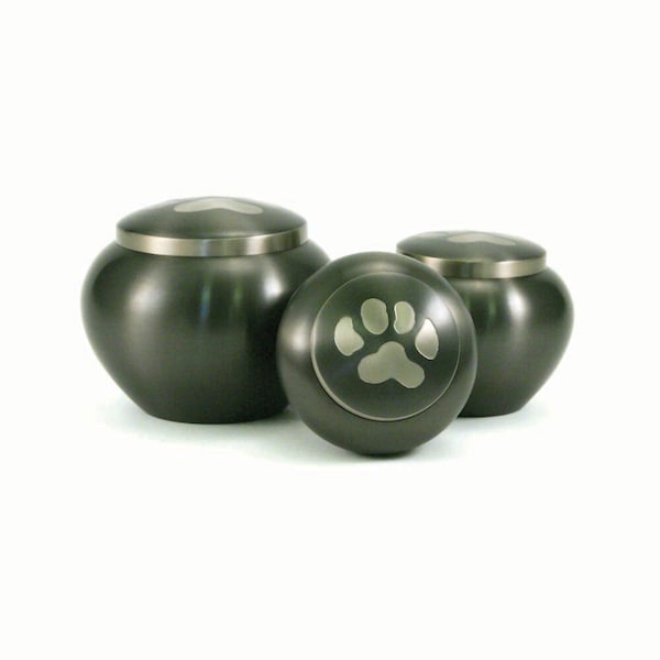 Jorvets designer style single paw odyssey pet urn comes in a size large and a slate/pewter color.