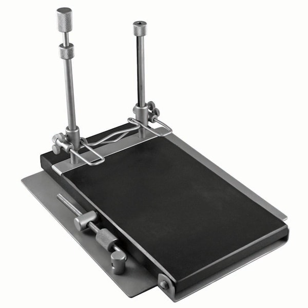 If you are serious about rabbit/rodent dentistry, this is the piece of equipment you need. This special device is designed for hands-free dental work on smaller pocket pets and rabbits. The support tilts to various angles. Two metal posts hold a mouth speculum via thin metal adjustable bars. This also serves to hold the animal's head steady and the mouth open to exactly the desired size. Fiber composite base.