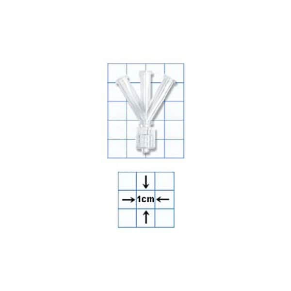 "W" or Wye fluid line connector 3 female luer locks to one male luer spin lock Clear plastic PVC Sterile