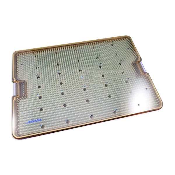 These autoclavable trays use a silicone pegged mat that allows the instruments to be placed in any configuration the surgeon desires. The instruments are easily located in the tray. The whole tray is wrapped and then autoclaved. Instruments not included. Tray. X-Large. Two layers. 15" x 10" x 1 3/4".