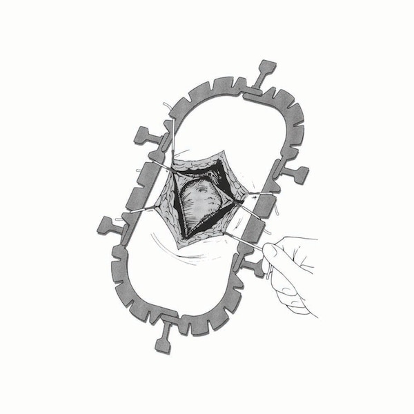 The Lone Star Veterinary Retractor System consists of two components, the autoclavable plastic ring and the accessory elastic stays. Because of its unique design, the retractor ring easily can be adapted to the patient's anatomy. The elastic stays allow the surgeon flexibility over the amount of tension applied and precise retraction of the incision without obstruction. Prep and drape patient in usual manner, then apply the retractor.