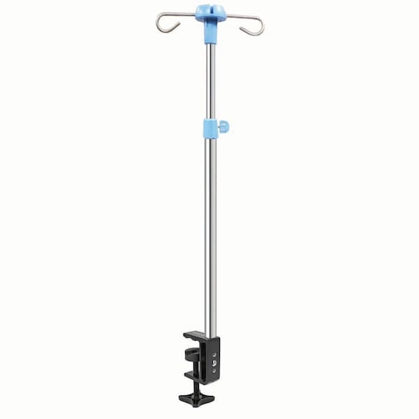 The Uni-Pole IV pole clamping system clamps on about anything like a surgery table rail or other flat surfaces. The IV pole is made of chromed steel construction and screws into the adjustable black aluminum mounting clamp. IV pole adjusts from 18" to 36" high Adjustable clamp mounts on flat surfaces or round pole up to 1.25" thick 2 ram horns IV bag holder