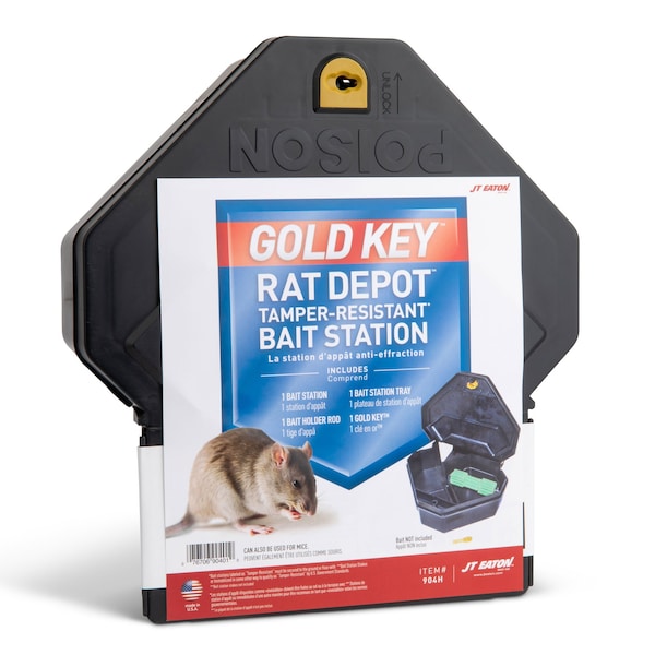 The JT Eaton 904H Gold Key Rat Depot is a tamper resistant bait station that can be used indoor or outdoor.