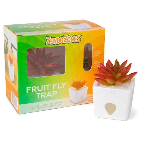 The JT Eaton 1818-JJ ZendoZones Fruit Fly Trap comes with the Joyful Janet succulent topper and white base. Fruit flies are attracted to the lure inside, fly in, and do not come out.