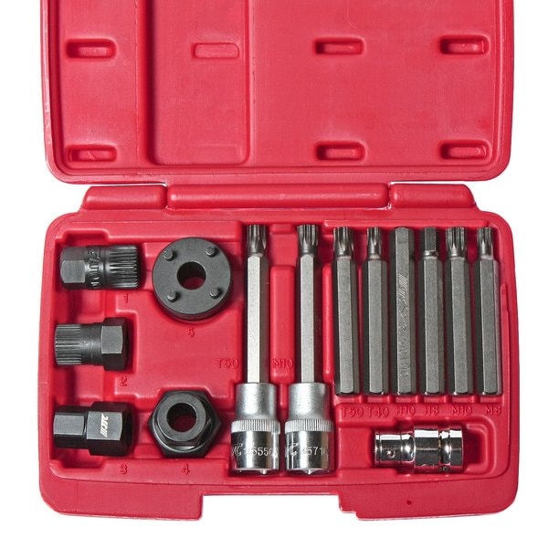 The alternator combination socket set is specially designed two-part socket for removing and replacing the free wheel pulley when wanting to replace the alternator or pulley. Contents: 1/2 in Dr. bit socket: M10, T50 x 110 mm = 2 pcs. 75 mm S2 power bit: M8, M10, H8, H10, T40, T50 = 6 pcs. Special reaction nut: #1 33T x 19.5 mm, #2 33T x 19.2 mm, #3 hex x 17 / 21 mm, #4 hex x 28 mm, #5 4P x 30.2 mm = 5 pcs. Application: VW, Audi, BMW, Ford, Skoda, Benz, Opel / Vauxhall, Porsche, Renault, Volvo, etc.