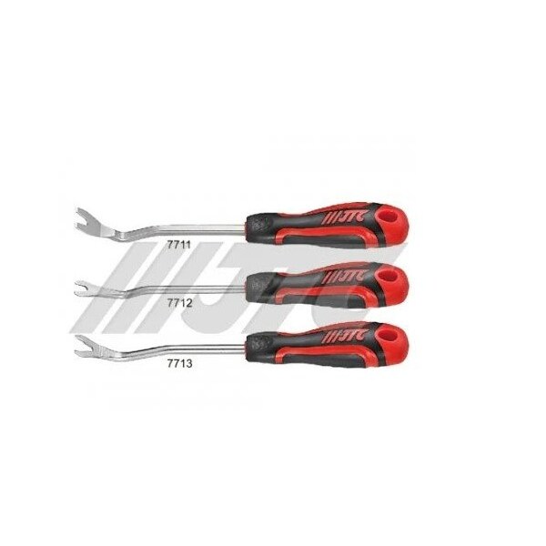 The upholstery clip remover 228 mm is designed to wedge the inner door trim staples. Place the tool under the edge of the door panel, insert into the holder, and then pry off. Handle: twin-color PP + TPR. Minimum aperture: Dia. 5. Maximum outside diameter: 13 mm. Total length: 228 mm.
