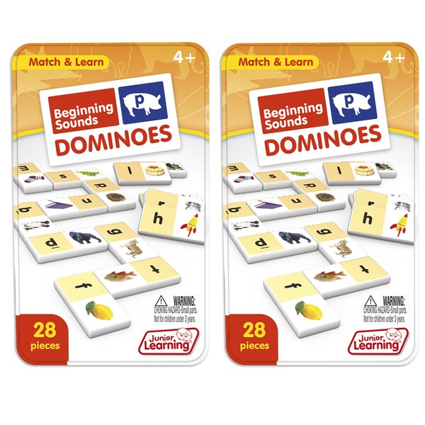 Beginning sound dominoes include a 28 piece set on thick plastic dominoes. Dominoes come in a collectors tin for storage. Children will love the feel of real dominoes as they complete the beginning sound matching game. Sold as 2 complete sets of dominoes.