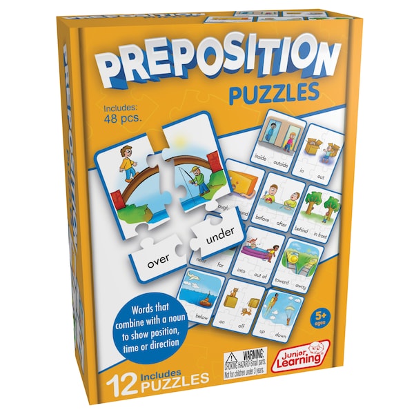 A Preposition is a word that combines with a noun to show position, time or direction (such as near and far). Match the words with their corresponding pictures, in this self-correcting puzzle, to create a completed card. Contains 48 pieces. Ages 5+