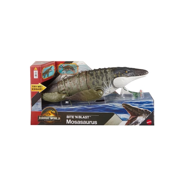 This Bite 'N Blast Mosasaurus dinosaur action figure with its distinctive aquatic design brings the excitement of Jurassic World Rebirth home. A button-activated Bite feature allows dramatic re-enactment of movie scenes and inspires creative play. Kids can control the attack by holding the tail and pressing the button to make the jaw open wide to bite - the mini Dilophosaurus figure that's included can be completely swallowed into the large Mosasaurus body. Press the button again to Blast the prey back out. With movable joints and movie-accurate design on the 25.7-inch long Mosasaurus it's ready for both play and display. Scan the Tracking Code under the fin in the free Jurassic World Play App with a compatible smart device (Android or iOS not included) to unlock a digital version of the dinosaur and play the fiercely fun game to race various vehicles on land air and sea. Makes a great gift for dinosaur fans ages 4 years and up. Colors and decorations may vary.