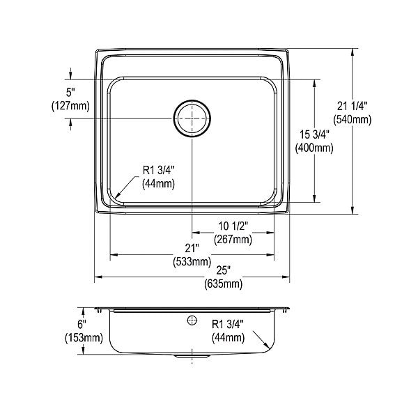 Bowl Drop-In Sink, 25"x21.25"x6", Gray