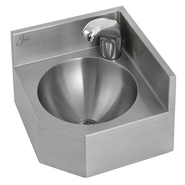 Corner Lavatory Sink, 304 Stainless Steel, Bowl 18 Gauge, Single Bowl, Back Splash 4 In., Mounting Type Wall Hung, Number of Holes 1, Silver Color/Finish, ADA Compliant No, Includes Deck Mounted Electronic Faucet