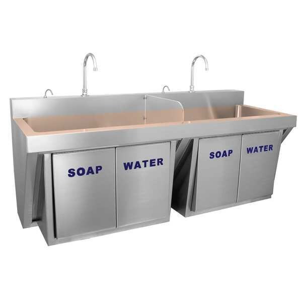 Scrub Sink, With Faucet, Body Material Stainless Steel, Mounting Type Wall, Color Copper, Overall Length 24 1/2 in, Overall Width 64 in, Overall Height 28 in, Bowl Size 17 1/2 in x 60 in, Bowl Depth 11 in, ADA Compliant No, Back Splash Yes, Bowl Shape Rectangular, Back Splash Height 4 in, Side Splash No, Faucet Operation Single Knee Pedal, Number of Stations 2, Drain Opening 2 in, Finish Polished, Gauge 16/18, Faucet Mounting Centers 1 in, Faucet Hole Dia. 1 1/2 in, Number of Holes 2