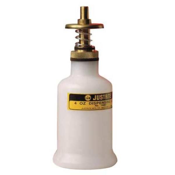Solvent Dispensing Bottle, Capacity 4 fl oz, Material Polyethylene, Color White, Standards FM Approved, Product Type Solvent Dispensing Bottle, Compatible Fluids Flammables, Container Diameter 2 1/4 in, Dispensing Actuation Dispensing Valve, Dispensing Tip Material Brass, Height 5 1/2 in