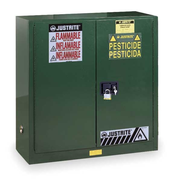 Pesticide Cabinet, Safety Cabinet Type Standard, Capacity 30 gal, Height 38 1/4 in, Width 43 in, Depth 18 in, Safety Cabinet Door Type Manual, Number of Cabinet Shelves 1, Color Green, Number of Doors 2