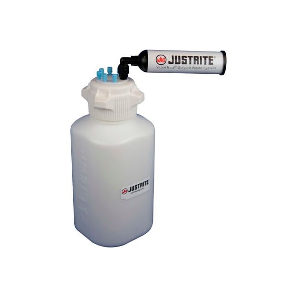 Justrite 12800 vaportrap carboy with filter kit, hdpe, 4-liter, 6 ports includes an hdpe carboy, two 83mm caps, waste tubing ports, carbon exhaust filter with straight & 90 degree adapter, tube fittings, gasket, and plugs.