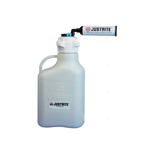 Justrite 12816 vaportrap cap with filter kit, hdpe, 20-liter, 8 ports includes an hdpe carboy, two 83mm caps, waste tubing ports, carbon exhaust filter with straight & 90 degree adapter, tube fittings, gasket, and plugs.