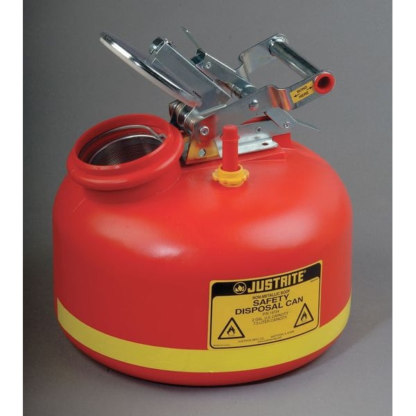 Flammable Liquid Disposal Can, Capacity 2 gal, Can Material Polyethylene, Material Finish Not Applicable, Color Red, Compatible Fluids Flammables, Product Type Flammable Liquid Disposal Can, Can Diameter 12 in, Cap Features Auto-Venting, Normally Closed, Spring-Closing, Height 14 3/4 in, Includes Plastic Drum Gauge, Includes Flame Arrestor Flame Arrestor Included, Standards OSHA