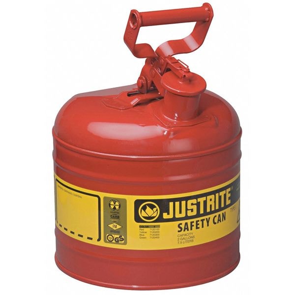 Type I Safety Can, Can Type Type I, DOT Approved Not DOT Approved, Capacity 2 gal, Compatible Fluids Flammables, Color Red, Can Material Steel, Material Finish Powder Coated, Hose Outside Diameter Not Applicable, Included Hose/Funnel Not Applicable, Can Diameter 9 1/2 in, Overall Height 13 3/4 in, Includes Faucet Faucet Not Included, Faucet Channel Diameter Not Applicable, Overall Width Not Applicable, Cap Features Auto-Venting, Leakproof, Self-Closing, Faucet Location Not Applicable