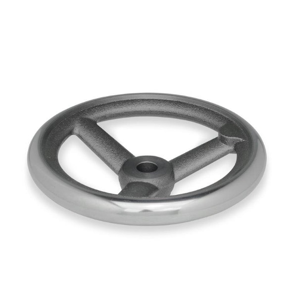 DIN 950 spoked handwheels, cast iron are supplied with handles made of steel. In aluminum they are supplied with handles made of plastic (type D) and made of steel (type F). No mounting hole in rim for handwheel without handle. Handle shipped loose; mounting of handle is required.