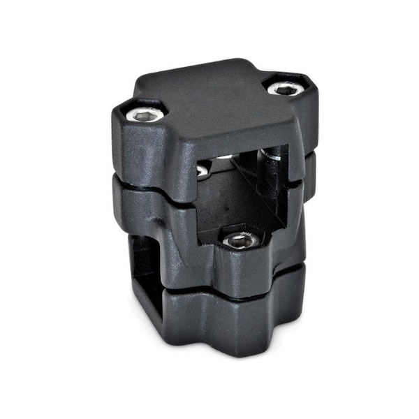 The clamping bores of GN 134 two-way connector clamps are machined and designed for construction tubings. The versions with square bores are also suitable for profile systems. Bores and square bores of the same nominal size can be assembled in any combination. The clamping force of the clamp onto the tube is achieved via the socket cap screws and hex nuts with nylon insert.