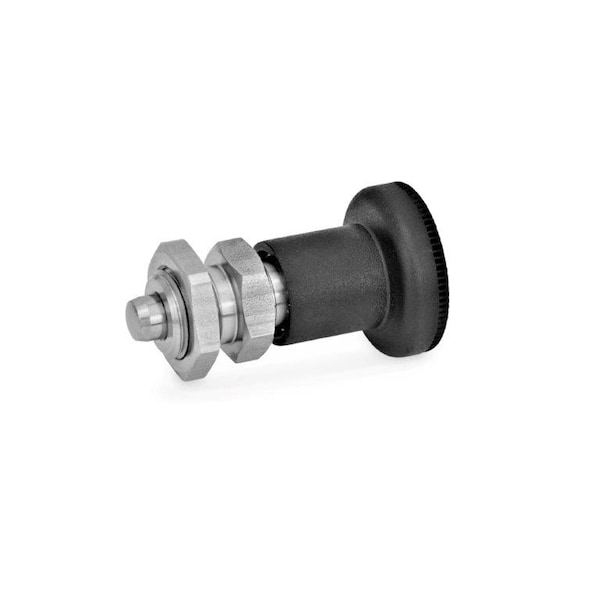 GN 607.1 short indexing plungers with lock-out are used for applications where the plunger pin needs to stay in its retracted position. To achieve this, the knob is rotated by 90 degrees after being retracted. A notch keeps the plunger in the retracted position.