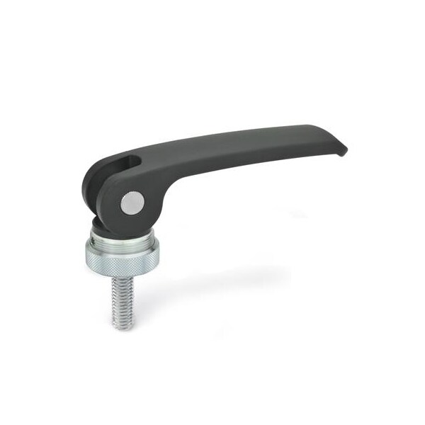 GN 927 clamping levers with eccentrical cam are used for rapid clamping and releasing operations. In contrast to a clamping operation utilizing only threads and a lateral force, these levers permit torque-free clamping via a combined downward vertical and cam actuated motion. The lever has been designed to ensure that its movement cannot exceed the maximum clamping position. There are no loose components since all are assembled and mounted in their correct order.