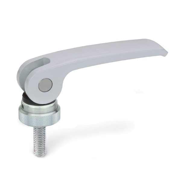 GN 927 clamping levers with eccentrical cam are used for rapid clamping and releasing operations. In contrast to a clamping operation utilizing only threads and a lateral force, these levers permit torque-free clamping via a combined downward vertical and cam actuated motion. The lever has been designed to ensure that its movement cannot exceed the maximum clamping position. There are no loose components since all are assembled and mounted in their correct order.
