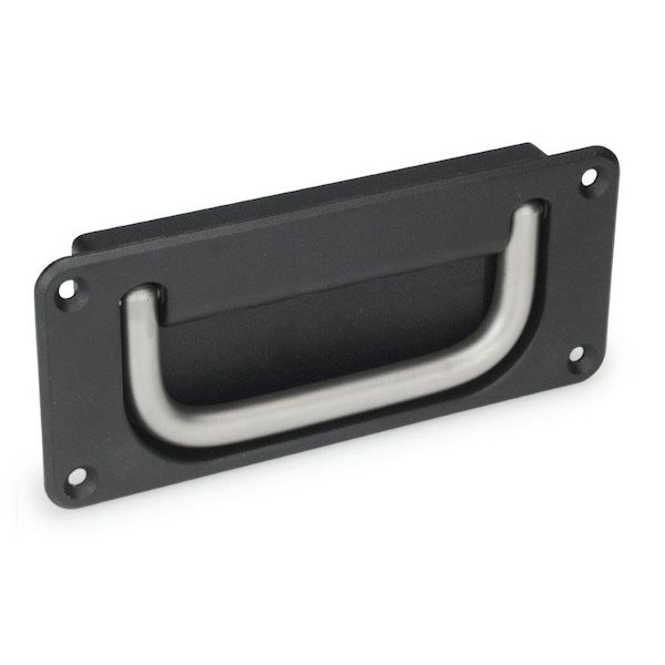 Recessed Folding Pull Handle, Mounting Type Unthreaded Holes, Material Stainless Steel, Finish Powder Coated, Mounting Hole Center to Center 6.06 in, Vert. Mounting Hole Ctr. to Ctr. 49 mm, Projection 1.59 in, Grip Thickness Not Applicable, Screw Size M4, Overall Length 6.69 in, Overall Width 2.56 in, Load Capacity 1124 lbf (Parallel), 225 lbf (Perpendicular), Grip Length 4.33 in, Color Black, Degree Offset Not Applicable, Standards RoHS Compliant
