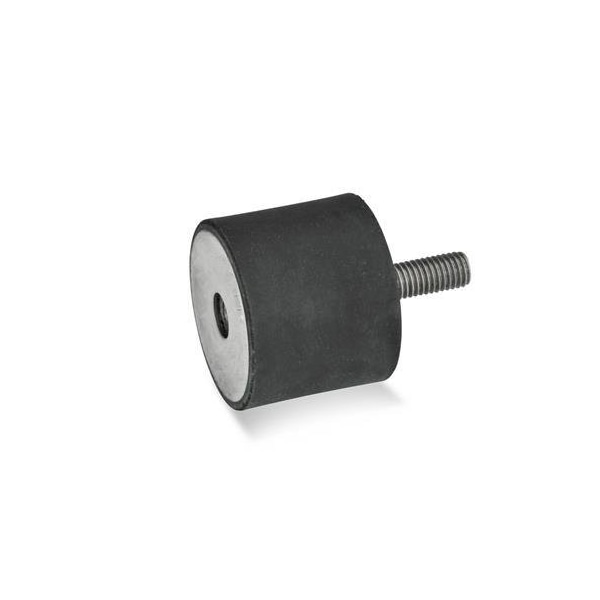Vibration-Isolating Mount, Vibration Isolator Style One Tapped Hole and One Threaded Stud, Maximum Load Downward Compression 2,167 lbf, Overall Diameter 100 mm, Height 2.95 in, Stud Length 41 mm, Maximum Load Sideways Shear 2,941 lbf, Thread Size M16, Durometer 55A, Isolator Material Natural Rubber, Maximum Operating Temperature 176 Degrees F, Mounting Compressor; Motor; Pump, Resistant To Abrasion; Wear, Shape Cylindrical, Stud or Tap Material 304 Stainless Steel, Tap Depth 14 mm