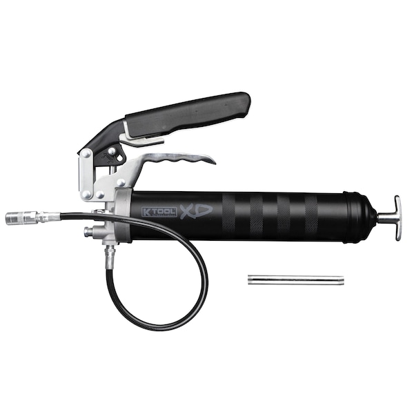 Adjustable stroke for changing pressure build up from 4500 PSI in pistol mode to 7000 PSI in lever mode;Variable grease discharge from 1 oz. per 40 strokes to 1 oz. per 22 strokes;Includes 6" Steel Extension, 18" flexible grease hose & coupler;Barrel with 0.049” (1.2 mm) wall thickness;Aluminum die cast head fitted with bulk loader & air bleeder valve;Non-slip comfortable vinyl grip handle;For use with 14 oz. Grease cartridge or 500 cc Bulk Fill;Max. air pressure to 100 PSI (7 BAR)